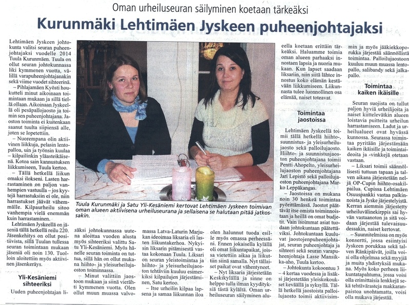 Tilaisuudessa Jyskeen puheenjohtajan nuija vaihtoi omistajaa. Noin 10 vuotta seuraa johtanut Satu Hauta-aho luovutti vetovastuun Tuula Kurunmäelle. Uutena seuran sihteerinä aloittaa 2014 alusta Satu Yli-Kesäniemi.