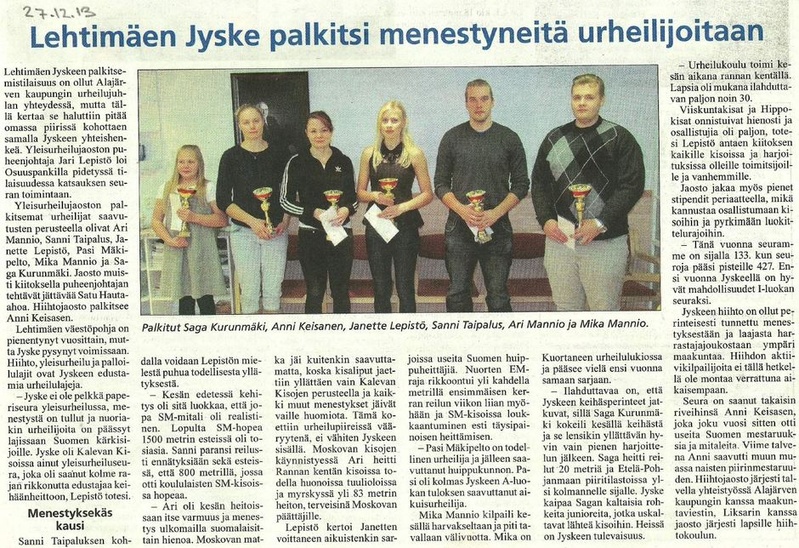 Lehtimäen Jyske palkitsi vuoden 2013 menestyneitä urheilijoitaan 15.12.